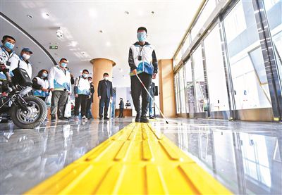 北京2022年冬殘奧會正在舉行,殘奧運(yùn)動員在賽場上的奮勇拼搏贏得了世界的掌聲。作為冬殘奧會的舉辦地之一,近年來,北京市的無障礙環(huán)境服務(wù)保障水平顯著提升且更有溫度。昨天,剛啟用不久的北京市殘疾人服務(wù)示范中心(以下簡稱“示范中心”)迎來了16位城市志愿者。他們在冬奧組委無障礙體驗(yàn)員的帶領(lǐng)下,戴上眼罩體驗(yàn)盲道、坐在匯愛影廳里“聽”電影、體驗(yàn)科技助殘的力量。