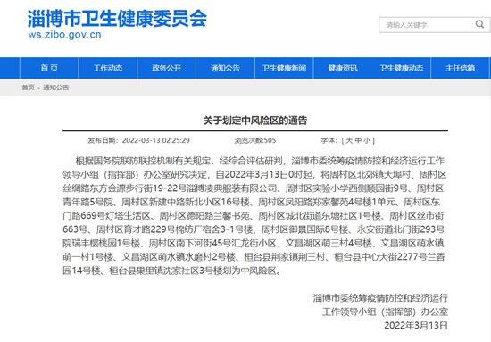 人民網(wǎng)淄博3月13日電(鄭浦麗)據(jù)淄博市衛(wèi)生健康委員會官網(wǎng)消息,根據(jù)國務院聯(lián)防聯(lián)控機制有關規(guī)定,經(jīng)綜合評估研判,淄博市委統(tǒng)籌疫情防控和經(jīng)濟運行工作領導小組(指揮部)辦公室研究決定,自2022年3月13日0時起,將周村區(qū)北郊鎮(zhèn)大埠村、周村區(qū)絲綢路東方金源步行街19-22號淄博凌典服裝有限公司、周村區(qū)實驗小學西側順園街9號、周村區(qū)青年路5號院、周村區(qū)新建中路新北小區(qū)16號樓、周村區(qū)鳳陽路鄭家馨苑4號樓1單元、周村區(qū)東門路669號燈塔生活區(qū)、周村區(qū)德陽路蘭馨書苑、周村區(qū)城北街道東塘社區(qū)1號樓、周村區(qū)絲市街663號、周村區(qū)育才路229號棉紡廠宿舍3-1號樓、周村區(qū)御景國際8號樓、永安街道北門街293號院瑞豐櫻桃園1號樓、周村區(qū)南下河街45號匯龍街小區(qū)、文昌湖區(qū)萌三村4號樓、文昌湖區(qū)萌水鎮(zhèn)萌一村1號樓、文昌湖區(qū)萌水鎮(zhèn)水磨村2號樓、桓臺縣荊家鎮(zhèn)荊三村、桓臺縣中心大街2277號蘭香園14號樓、桓臺縣果里鎮(zhèn)沈家社區(qū)3號樓劃為中風險區(qū)。