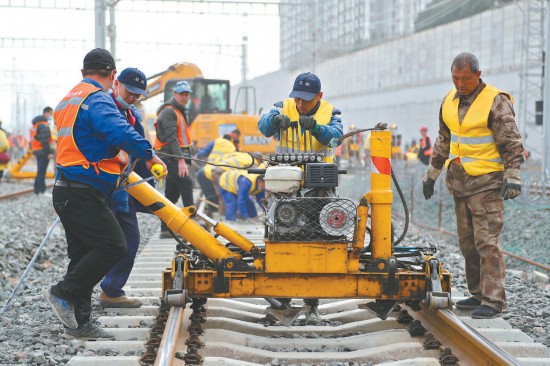 昨天上午,豐臺站改建工程計算機聯(lián)鎖封鎖施工、撥線施工開始,七百余名施工人員同時作業(yè)保障工程順利完成。本報記者 安旭東攝