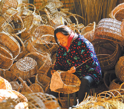 2021年12月28日,安徽省阜陽市阜南縣郜臺鄉(xiāng)劉店村農(nóng)戶在“柳編巷”內加工編織工藝品。