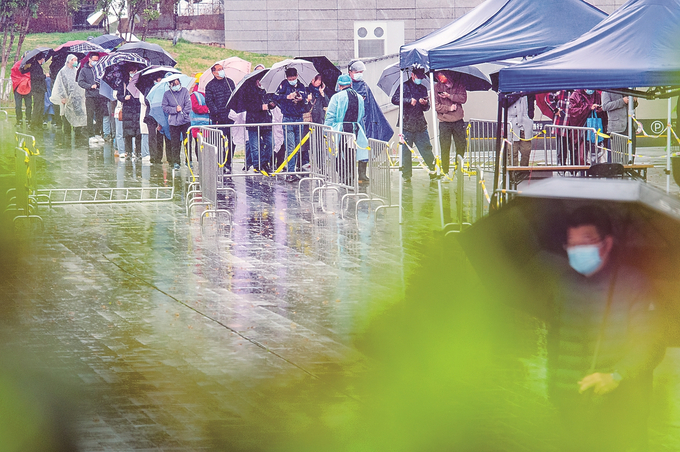 3月17日,南京市民在雨中有序排隊(duì)等待核酸檢測(cè)。本報(bào)記者 吳俊 攝