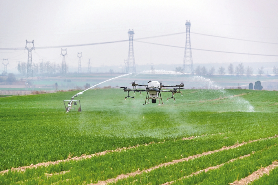 3月21日,在運(yùn)城市夏縣胡張鄉(xiāng)新晉村有機(jī)旱作小麥基地,當(dāng)?shù)剞r(nóng)民利用植保無人機(jī)為麥田施肥。眼下正值春耕春管的關(guān)鍵期,夏縣糧農(nóng)搶抓有利農(nóng)時,對全縣31.6萬畝冬小麥開展病蟲草害和極端天氣的應(yīng)對防范,及早動手澆水、施肥、噴藥,全面開展春季麥田管理,提高畝產(chǎn)效益,為全年糧食豐收打下堅實基礎(chǔ)。(閆鑫攝)