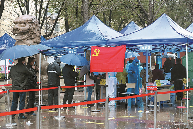 南京市發(fā)布關于疫情防控措施動態(tài)升級調整的通告(第11號),自21日起,南京市在全市開展新一輪分區(qū)域規(guī)模性核酸檢測。圖為鼓樓區(qū)下關街道閱江樓核酸檢測點,市民在接受核酸采樣。 本報記者 陳儼 攝