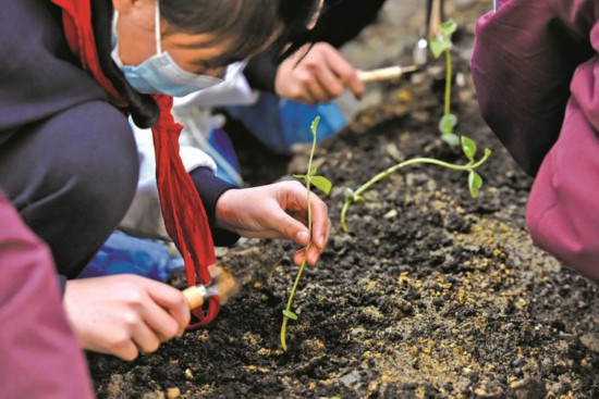 3月23日,嘉興一學(xué)校種植園,學(xué)生們?cè)诟靼嗟摹柏?zé)任田”里忙著種植各種蔬菜和花卉。學(xué)校希望通過(guò)豐富多彩的種植活動(dòng),讓孩子們?cè)谟H近植物、探究植物的過(guò)程中,提升綜合探究學(xué)習(xí)能力,同時(shí)也更好地推進(jìn)學(xué)?!半p減”政策的落地。(馮玉坤)
