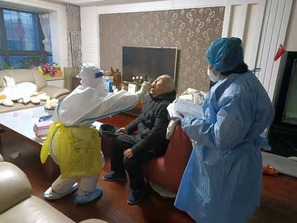 孫麗群(右)與醫(yī)護人員一同上門為居家老人做核酸檢測。受訪者供圖