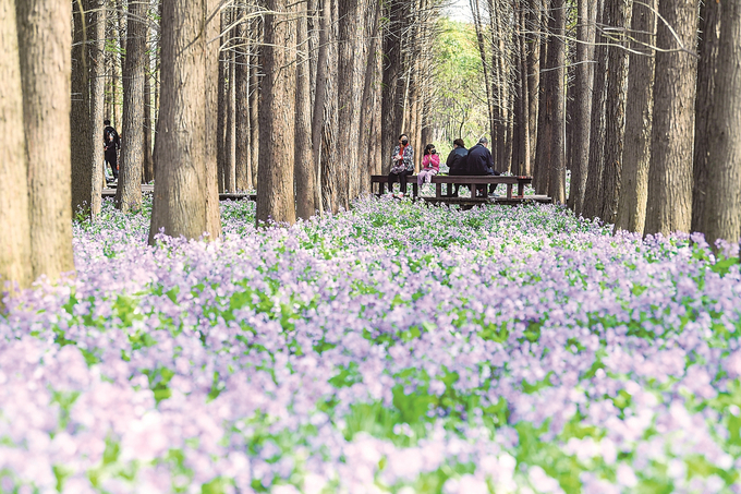 3月26日,天氣晴好,建鄴區(qū)江心洲青奧森林公園內(nèi)的二月蘭匯成一片紫色花海,春意盎然。漫步在林中曲折的生態(tài)廊道,遍布林間的二月蘭和高大靜謐的茂密池杉林共同構(gòu)成了一幅引人入勝的“外景地”。 本報記者 邵丹 攝