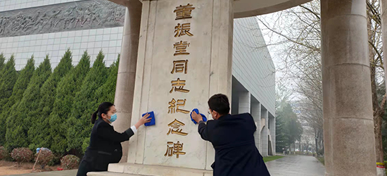 擦拭董振堂紀念碑。 如月攝