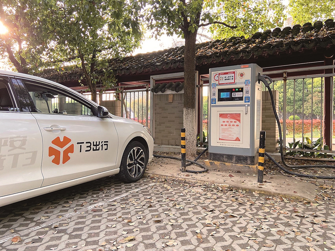 南京寶船聽濤廣場內,一輛新能源網(wǎng)約車正在充電。董翔 攝