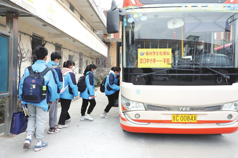 2013年,陽泉市平定縣實(shí)行交通惠民“暖心工程”,開通了免費(fèi)接送寄宿制學(xué)生專用車,每周五下午到校接送學(xué)生回家,周一早晨再接送他們安全返校。截至目前,平定公交公司共開通接送寄宿生專線72條,投入運(yùn)營車輛95臺(tái),覆蓋全縣10個(gè)鄉(xiāng)(鎮(zhèn))的202個(gè)村莊、31所學(xué)校、2600余名寄宿制學(xué)生。圖為近日,該縣岔口中學(xué)操場上,分散居住在十里八鄉(xiāng)的寄宿制學(xué)生正準(zhǔn)備乘車回家。(張春林?jǐn)z)