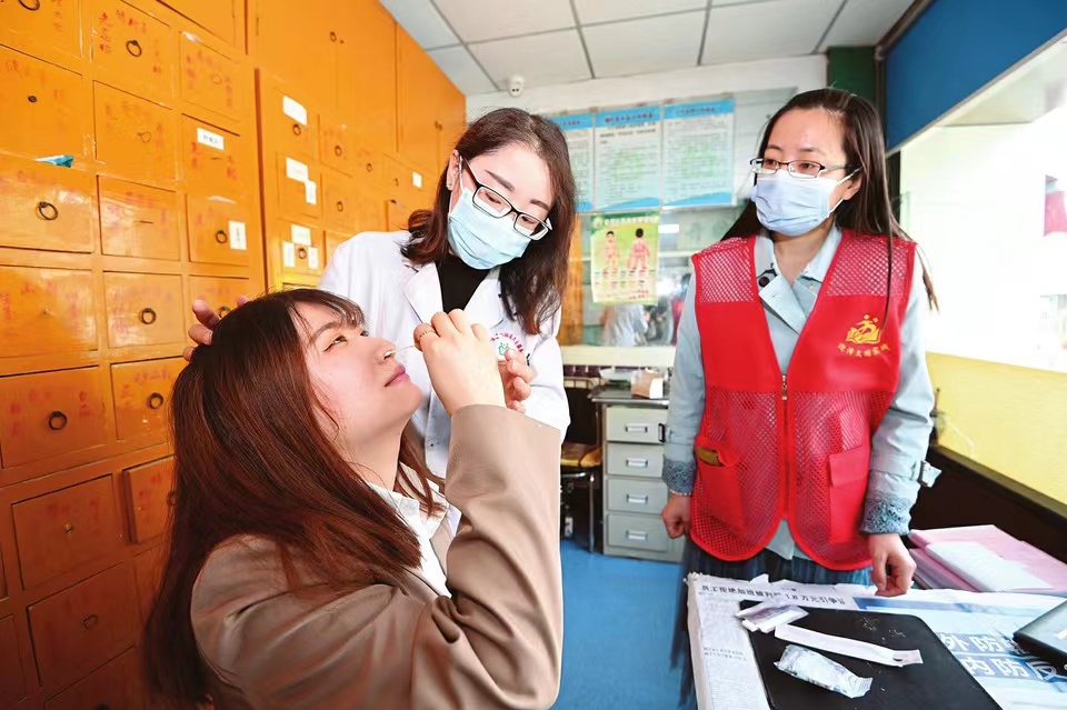 4月6日,太原市迎澤區(qū)老軍營社區(qū)衛(wèi)生服務站內,老軍營二社區(qū)工作人員和衛(wèi)生服務站的醫(yī)護人員在學習使用新冠抗原檢測試劑,掌握使用方法和檢測結果確認方式。當日,老軍營二社區(qū)與社區(qū)衛(wèi)生服務站聯(lián)合引入新冠抗原檢測試劑,組織工作人員學習使用,以便試劑下發(fā)居民之后快速教授居民使用方法。(記者阮洋攝)