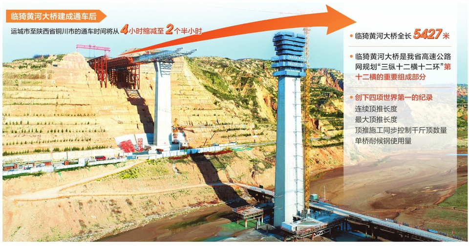 臨猗黃河大橋是連接晉陜最長的黃河公路大橋,全長5427米,主橋采用等高度連續(xù)鋼箱組合梁,從山西、陜西兩處頂推平臺對向頂推,這也創(chuàng)下連續(xù)頂推長度、最大頂推長度、頂推施工同步控制千斤頂數(shù)量以及單橋耐候鋼使用量四項世界第一的紀錄。