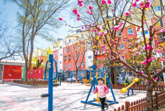 大興區(qū)興豐街道老小區(qū)黃村西里社區(qū)在居民的共同維護(hù)下,居住環(huán)境整潔舒適。圖為提升后的社區(qū)廣場(chǎng)上,小朋友正在樂(lè)享春光。本報(bào)記者 武亦彬攝