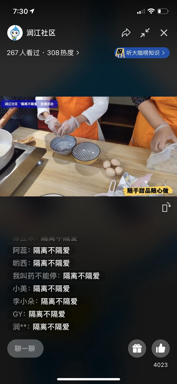 在這個特殊的“戰(zhàn)疫”時刻,潤江社區(qū)依舊在3月29日-4月3日6天時間里陸續(xù)推出了包括心理疏導課程、健身指導課程、烘焙分享、家庭收納、親子共讀和感悟分享在內的直播內容。截至目前,“小杜直播間”已經吸引了社區(qū)內近1500人次觀看,這些直播內容貼合了社區(qū)居民的需求,從各方面為居民緩解居家的焦慮、豐富居民的居家生活。