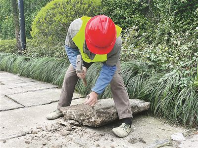 “我們秉持‘最小干預’的原則——結(jié)構(gòu)層穩(wěn)定的老石板,原則上不修;需要修繕的老石板,則嚴格遵守‘修舊如舊、保留肌理’的原則?!焙贾輬@林設計院股份有限公司相關負責人介紹,“一般兩種情況下才進行修復,一是樹池周邊起拱、松動嚴重,二是老石板破損、松動嚴重?!?/p>