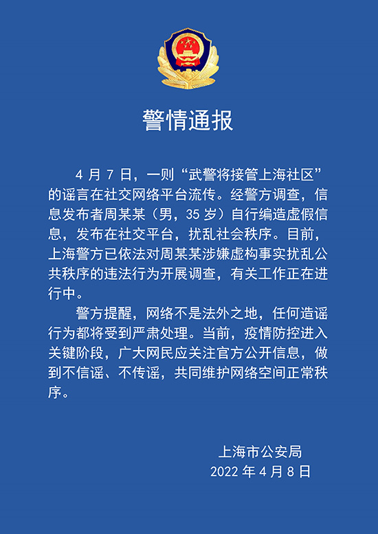 人民網(wǎng)上海4月8日電(王文娟)據(jù)上海市公安局通報(bào):4月7日,一則“武警將接管上海社區(qū)”的謠言在社交網(wǎng)絡(luò)平臺(tái)流傳。經(jīng)警方調(diào)查,信息發(fā)布者周某某(男,35歲)自行編造虛假信息,發(fā)布在社交平臺(tái),擾亂社會(huì)秩序。目前,上海警方已依法對(duì)周某某涉嫌虛構(gòu)事實(shí)擾亂公共秩序的違法行為開(kāi)展調(diào)查,有關(guān)工作正在進(jìn)行中。