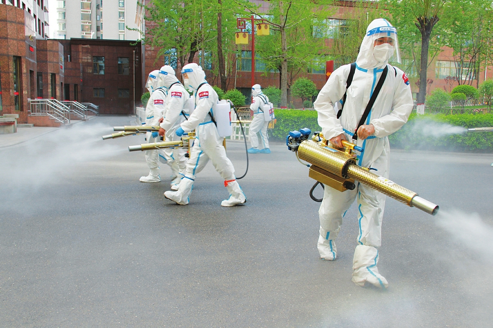 4月12日,在小店區(qū)千禧學(xué)府苑小區(qū),太原市應(yīng)急管理綜合行政執(zhí)法支隊的消殺隊員們正在消殺。隨后他們來到西吳村社區(qū)、丁香園、恒大綠洲、長風(fēng)小區(qū)等居民住宅區(qū),對所有樓棟、垃圾點及室外公共區(qū)域等進(jìn)行全面消殺,牢牢筑起健康防線。(記者尤麗云攝)