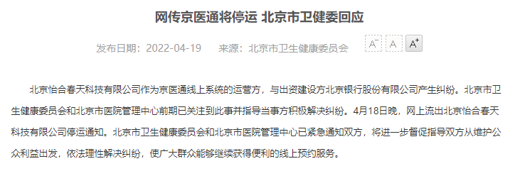 4月18日晚,網(wǎng)上流出北京怡合春天科技有限公司停運通知。北京市衛(wèi)生健康委員會和北京市醫(yī)院管理中心已緊急通知雙方,將進一步督促指導雙方從維護公眾利益出發(fā),依法理性解決糾紛,使廣大群眾能夠繼續(xù)獲得便利的線上預約服務。