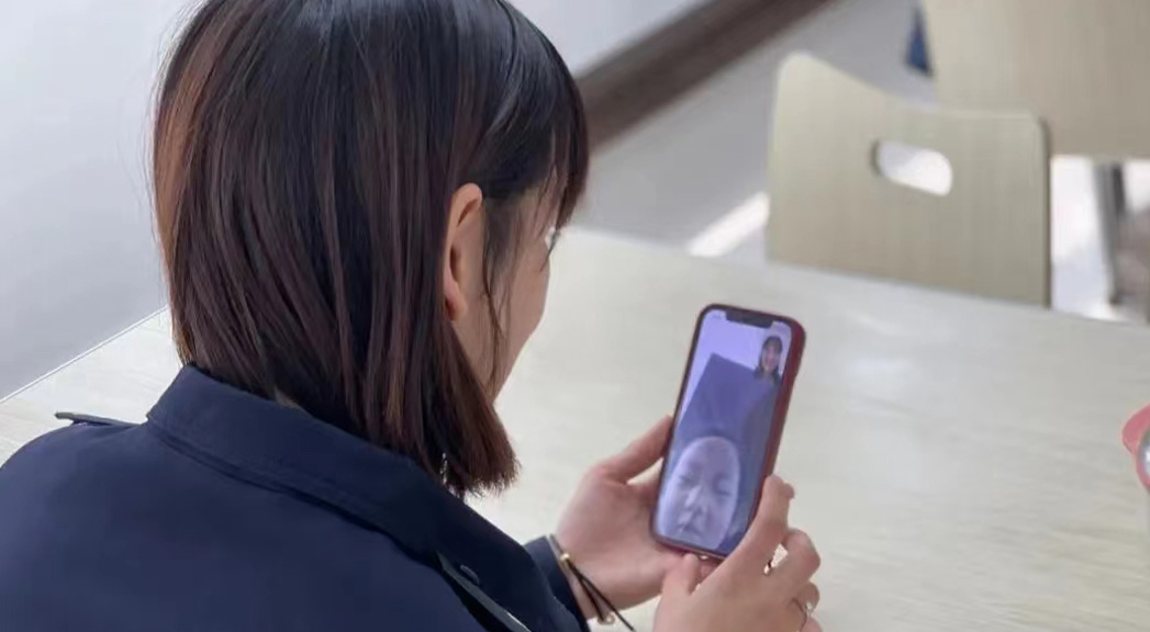 接到參加疫情防控任務的命令后,張思遙吃住在單位,休息時才有時間跟孩子視頻。 邢臺市公安局供圖