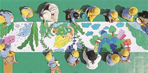 4月21日,臺州仙居縣幼兒園的孩子們在老師指導(dǎo)下創(chuàng)作珍愛地球主題繪畫作品。當日,幼兒園開展以“珍愛地球 人與自然和諧共生”為主題的教育活動,迎接“世界地球日”到來。通過繪長卷、環(huán)保時裝秀、垃圾分類等教育活動,引導(dǎo)孩子們愛護環(huán)境,共同守護地球母親。