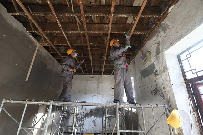 按照計劃,樓頂將由原來的木質(zhì)大屋脊整體更換為樹脂瓦阻燃屋面。而在第一階段改造中,樓體阻燃,為居民量身訂制燃?xì)夤?,配?4小時巡護“管家”,每天進(jìn)行巡查記錄并拍攝現(xiàn)場照片均已完成。一層的臨街房屋內(nèi)的夾層已經(jīng)拆除完畢,木制窗已經(jīng)更換為塑鋼窗,原來的薄墻面上加裝硅酸鈣板,地面鋪設(shè)了耐火地板磚,屋頂?shù)跹b了石膏板。二層樓內(nèi)木樓板已鋪設(shè)耐火瓷磚,樓內(nèi)電線電纜進(jìn)行了梳理排查,完成了整體更換,鋪設(shè)了不銹鋼槽式電纜橋架,確保樓內(nèi)居民用電安全穩(wěn)定。