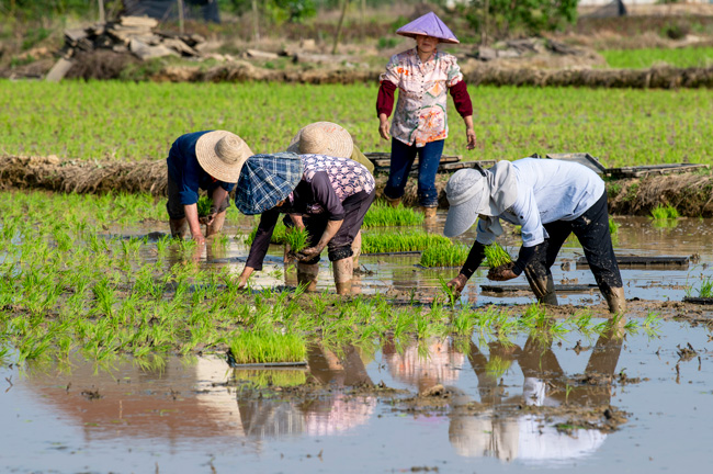 4月24日,金華市婺城區(qū)蔣堂鎮(zhèn)洪村田間地頭,農民在搶農時忙插早稻秧苗。谷雨節(jié)氣剛過,正是水稻栽種的好時機,但受疫情影響,大型農機和操作人員難以進入,機械化種糧進程受阻。為不耽擱農時,當地種糧大戶組織人力進行早稻插秧。(胡肖飛)