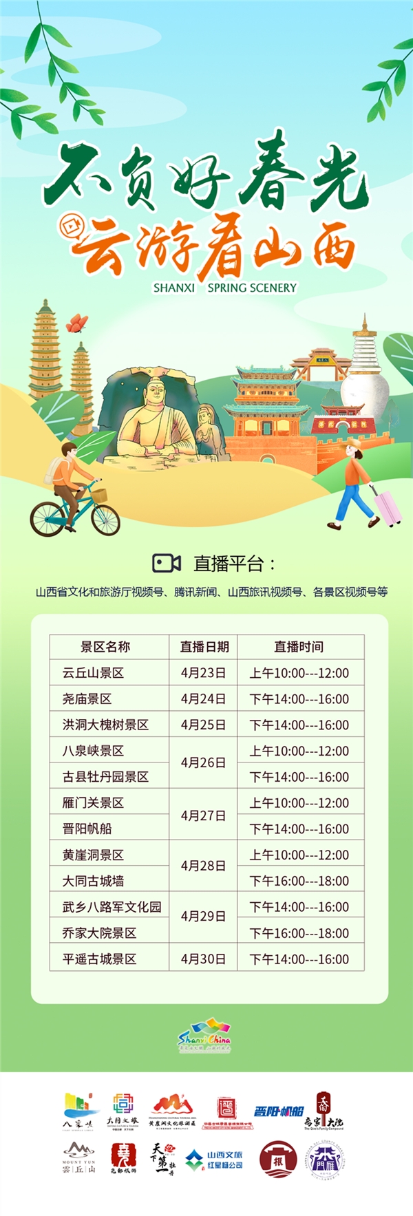 據(jù)了解,本次直播活動共有12家山西景區(qū)參與,包括平遙古城、云丘山景區(qū)、八泉峽景區(qū)、洪洞大槐樹景區(qū)、雁門關(guān)景區(qū)5家5A級景區(qū),以及堯廟景區(qū)、黃崖洞景區(qū)、武鄉(xiāng)八路軍文化園、古縣牡丹文化園、大同古城墻在內(nèi)的5家4A級景區(qū),還有喬家大院景區(qū)、晉陽帆船體驗項目的加入,為本次直播活動增添了別樣的趣味。直播活動將從4月23日開始持續(xù)到4月30日,每天上午10:00—12:00、下午14:00—16:00、16:00—18:00,共3個時間段進行景區(qū)重點旅游資源推介、春季踏青賞花線路、以及城市周邊游等主題產(chǎn)品介紹。