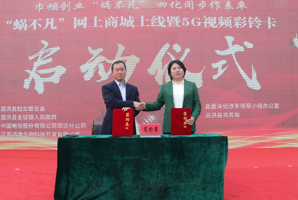 近日,江蘇省泗洪縣婦聯(lián)、改革辦、商務(wù)局、金鎖鎮(zhèn)人民政府和電信公司聯(lián)合舉辦“巾幗創(chuàng)業(yè)‘蝸不凡’,‘四化’同步作表率”現(xiàn)場(chǎng)活動(dòng),助力鄉(xiāng)村企業(yè)數(shù)字化復(fù)工復(fù)產(chǎn)。“蝸不凡”網(wǎng)上商城正式上線,5G視頻彩鈴卡同步啟動(dòng),電信公司和“蝸不凡”品牌企業(yè)簽訂了“云改數(shù)轉(zhuǎn)”合作協(xié)議。