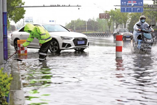 4月26日,在嘉興市區(qū)中山西路,因短時(shí)暴雨造成部分路段臨時(shí)積水,來(lái)自周邊企業(yè)的志愿者堅(jiān)守在大雨中清除路面積水,保障過(guò)往車輛及行人的交通安全。(馮玉坤)