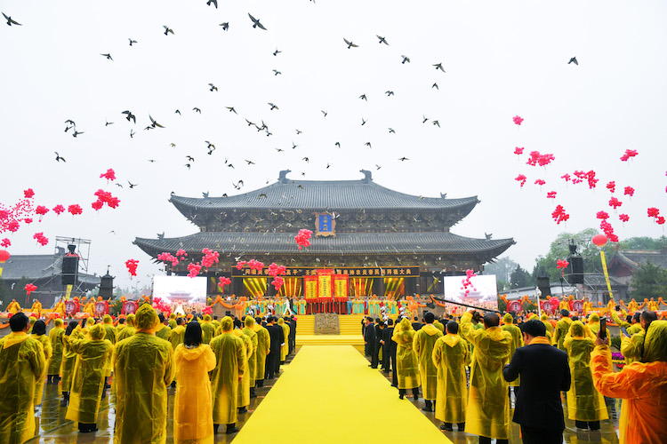 上午9時50分,拜祖大典正式開始。全體肅立,擊鼓九通、鳴鐘九響,恭啟圣門。莊嚴肅穆的炎帝大殿前,讀拜祖文,現(xiàn)場民眾行施拜禮。隨后,舉行了祭拜神農(nóng)炎帝的傳統(tǒng)儀式“敬十獻禮”,64名莘莘學子身著古代禮服敬獻“八佾舞”。甘霖細雨中,伴隨著《炎帝頌》磅礴激昂的歌聲,和平鴿振翅高飛、紅氣球騰空而起,在莊嚴祥和的氣氛中,大典禮成。