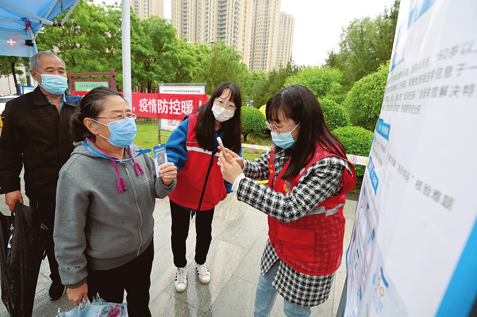 5月12日,太原市和平公園核酸檢測點(diǎn),老年居民體驗“反向掃碼”帶來的便捷。據(jù)了解,常態(tài)化疫情防控下,為保障老年人和未成年人便捷出入公共場所,萬柏林區(qū)為60歲以上老年人及未成年人免費(fèi)發(fā)放集健康碼、行程卡、核酸檢測報告等信息于一體的愛心碼出行卡,用“反向掃碼”新舉措解決特殊群體“亮碼”難題。(記者阮洋攝)