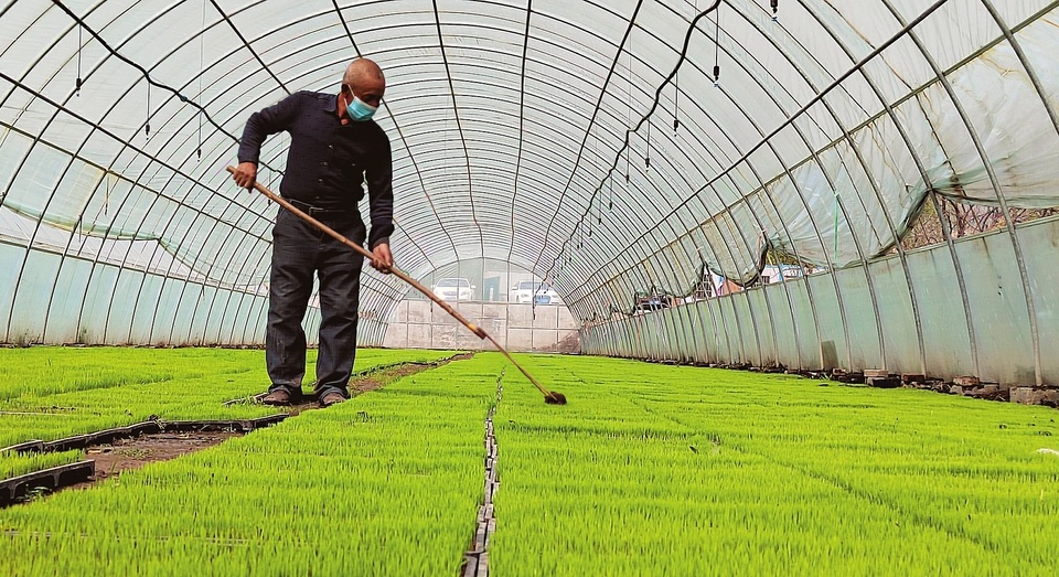5月14日,太原市晉源區(qū)花塔村育秧基地村民正在護理秧苗。眼下正是農(nóng)忙時節(jié),晉源區(qū)在去年花塔村自動育秧基地的基礎上,新擴建王郭村、北大寺村、稻花城3個育秧基地,優(yōu)選新稻種,擦亮區(qū)域性特色農(nóng)產(chǎn)品品牌。當?shù)赜行蚪M織村民推進育秧、整地等,滿足全區(qū)3300畝晉祠水稻的插秧需求。(記者李兆民攝)