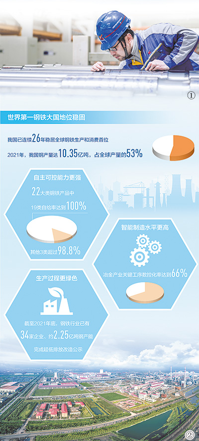 自主可控能力更強。22大類鋼鐵產(chǎn)品中,19類自給率達到100%,其他3類超過98.8%,保障了重大工程重點項目的實施。