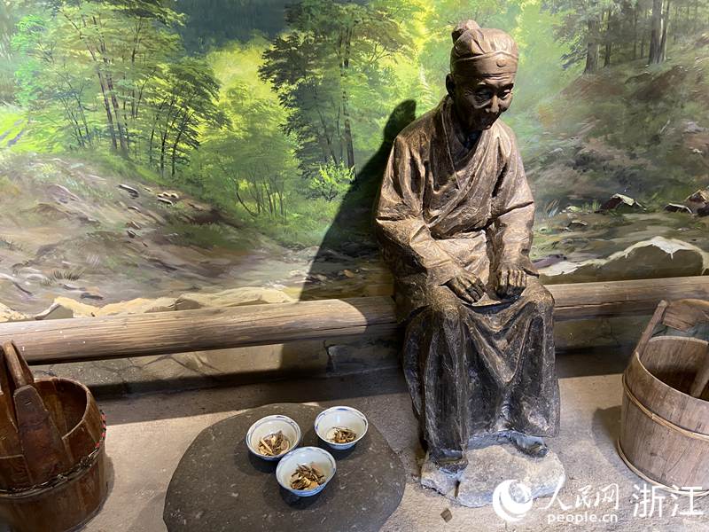中國自古有施茶傳統(tǒng),鄉(xiāng)間有三里立茶亭、十里建長亭施茶,供路人休憩的風俗。在茶之俗展廳,記者看到了一比一還原的施茶場景:施茶者坐于亭內,面前是3碗裝有端午茶的茶碗,等待過往路人前來飲用。施茶的習俗也體現(xiàn)了松陽人樂善好施的傳統(tǒng)美德。