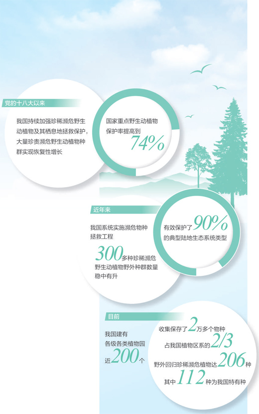 近年來,我國系統(tǒng)實(shí)施瀕危物種拯救工程,采取就地保護(hù)、遷地保護(hù)、放歸(回歸)自然、人工繁育(培植)等措施,有效保護(hù)了90%的典型陸地生態(tài)系統(tǒng)類型,300多種珍稀瀕危野生動(dòng)植物野外種群數(shù)量穩(wěn)中有升。目前,我國建有各級各類植物園近200個(gè),收集保存了2萬多個(gè)物種,占我國植物區(qū)系的2/3。野外回歸珍稀瀕危植物達(dá)到206種,其中112種為我國特有種。麋鹿、普氏野馬曾一度在野外消失,目前通過人工繁育等方式,總數(shù)分別達(dá)近1萬只和700只左右,并成功實(shí)施放歸自然,重新建立了野外種群,生存區(qū)域和范圍不斷擴(kuò)大。