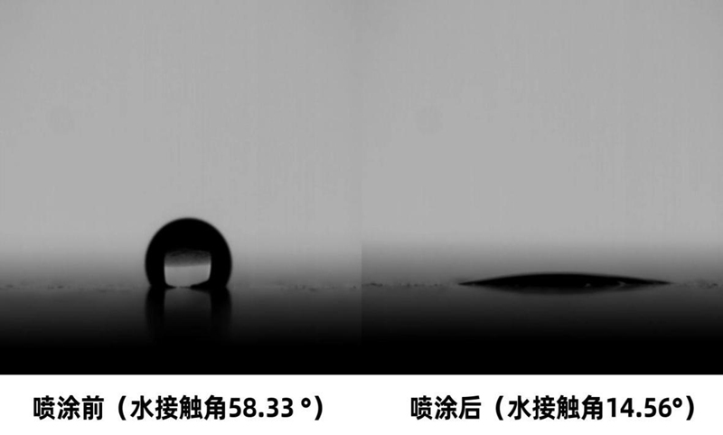 顯微鏡下,材料在噴涂了光催化涂料后表現(xiàn)出的超親水性。浙江和諧光催化科技有限公司供圖