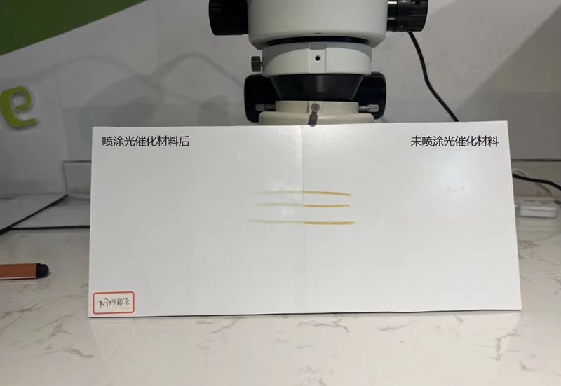“將一塊鋁面板一分為二,一塊噴涂光催化涂膜,另一塊不噴涂。用有機染料筆模仿外界污染物,在兩塊材料表面標記后,通過一分鐘紫外光燈照射,可看出噴涂了光催化涂膜的瓷磚鋁板部分染料降解效果明顯更高。”工作人員告訴人民網(wǎng)浙江頻道,根據(jù)國家權(quán)威檢測機構(gòu)的實驗證明,每噴涂1立方米的光催化涂膜,就能清除95%的甲醛。