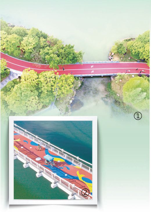 圖①:江西省贛州市章貢區(qū)一處濕地公園內(nèi)的健身步道。