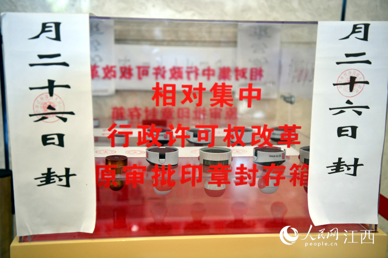 南昌紅谷灘區(qū)設(shè)立“難事直通車(chē)”專(zhuān)窗,優(yōu)化營(yíng)商環(huán)境。圖為紅谷灘區(qū)行政審批局內(nèi)展示封存的原審批印章。人民網(wǎng) 時(shí)雨攝