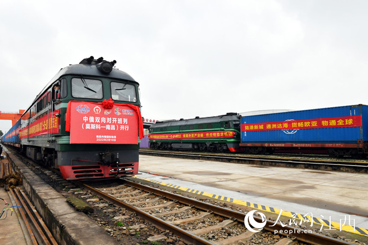 2月19日,2022年江西省首列中俄雙向?qū)﹂_班列(南昌—莫斯科)在南昌向塘國際陸港成功到發(fā)?!皩﹂_班列”的開行將大大提高集裝箱周轉(zhuǎn)效率,降低企業(yè)運(yùn)輸成本。 人民網(wǎng) 時(shí)雨攝