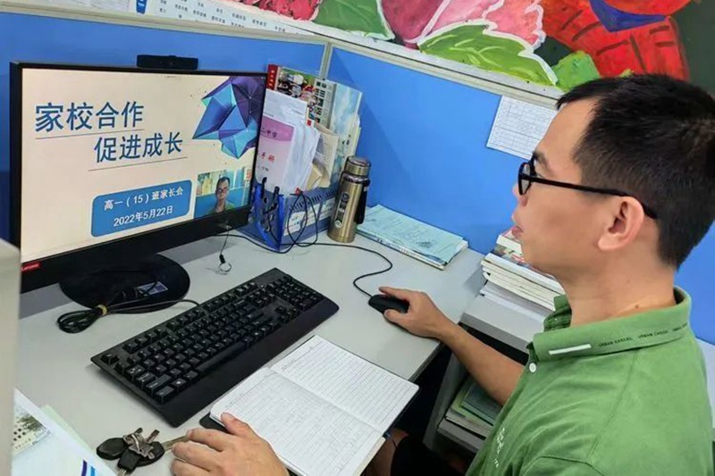 5月22號(捐獻造血干細胞的前一天),韓熠光在年級辦公室召開線上家長會。??谑械诙袑W供圖