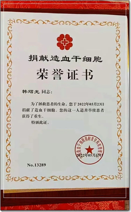 作為一名黨員,韓熠光一直熱心公益。2001年參與無償獻血,累計獻血量達1400毫升;2008年,他選擇成為一名中華骨髓庫志愿捐獻者;2022年,成為了海南省第144例捐獻造血干細胞的英雄……