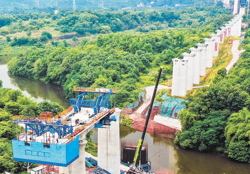 近日,西部(重慶)科學(xué)城巴福鎮(zhèn),渝昆高鐵川渝段三百梯水庫(kù)道岔特大橋施工現(xiàn)場(chǎng)一片繁忙。