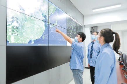 調(diào)度指揮中心人員利用衛(wèi)星云圖進行“觀云追雨”分析和降雨量的研判。