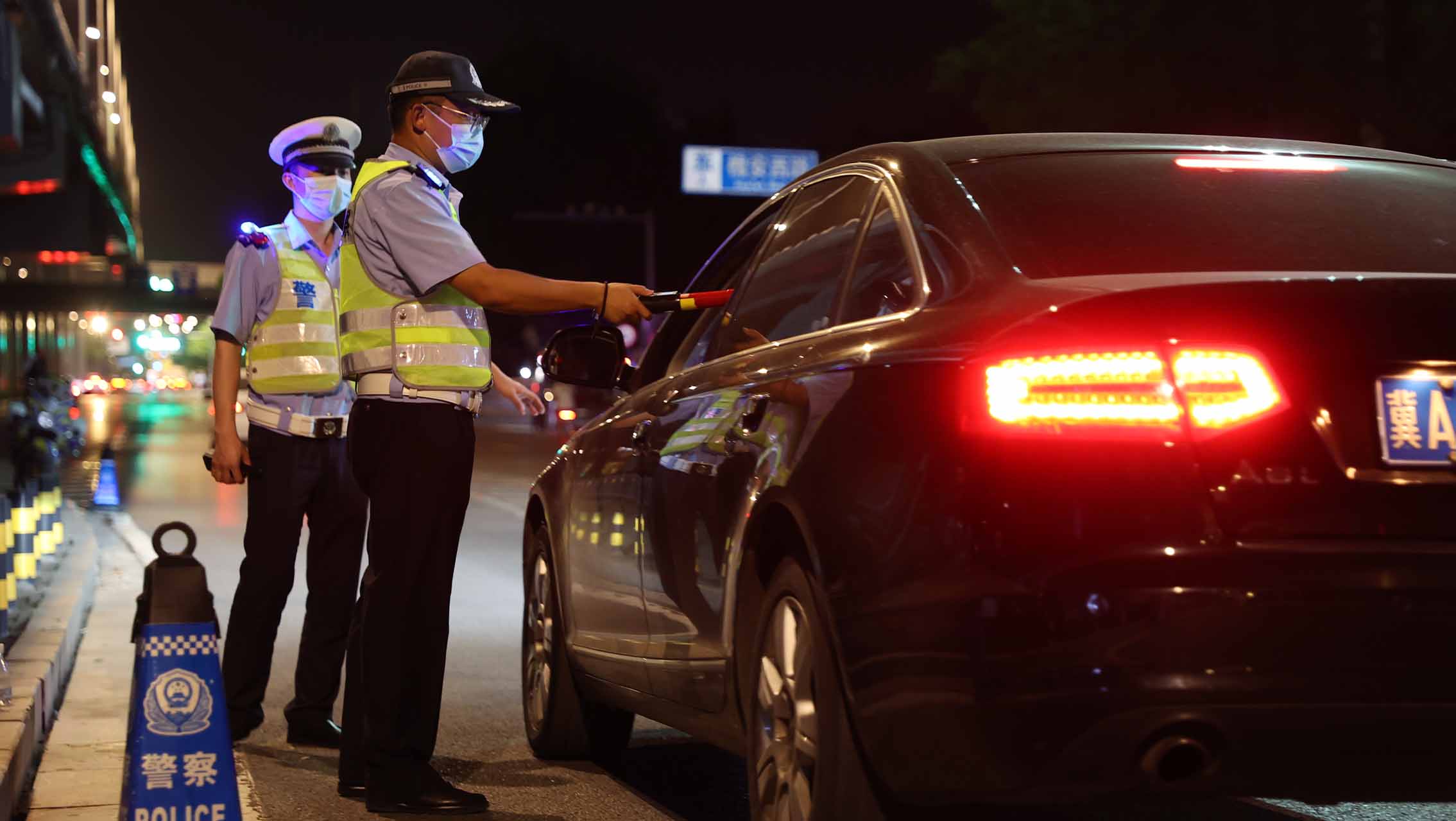 石家莊橋西交警大隊(duì)民警在槐安路廣平街口開展酒駕醉駕檢查。 王浩天攝