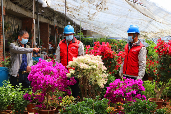 5月25日,冀北承德圍場(chǎng)公司四合永供電所黨員服務(wù)隊(duì)隊(duì)員到四合永鎮(zhèn)營(yíng)字村海岱溝鳳利花卉園藝大棚檢查用電設(shè)備。 劉春學(xué)攝