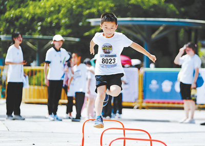 5月29日,小朋友在中國(guó)少兒田徑月·廈門(mén)少兒趣味田徑運(yùn)動(dòng)會(huì)上跨越障礙。