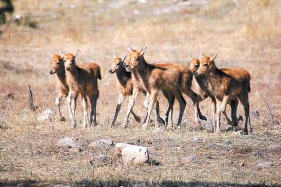 新出生的小麋鹿們在大青山茁壯成長。