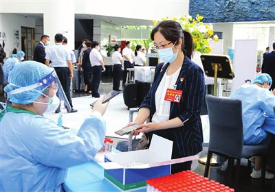 因新冠疫情防控需要,此次黨代會(huì)實(shí)行全程閉環(huán)管理?!罢埬葴y一下體溫?!惫ぷ魅藛T熱情地引導(dǎo)著。代表們佩戴口罩,保持間距,有序完成測溫、驗(yàn)碼、安檢、流調(diào)、核酸檢測,隨后全身心投入到參會(huì)各項(xiàng)準(zhǔn)備工作。