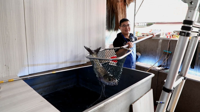 林加昌正忙著從魚箱里撈出活魚。文成縣委宣傳部供圖