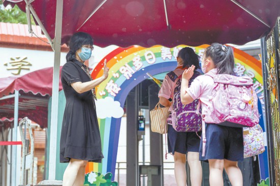 昨天早晨,豐臺區(qū)芳古園小學,因疫情闊別校園多日的小學生返校復課,老師在校門口歡迎孩子們歸來。本報記者 鄧偉攝